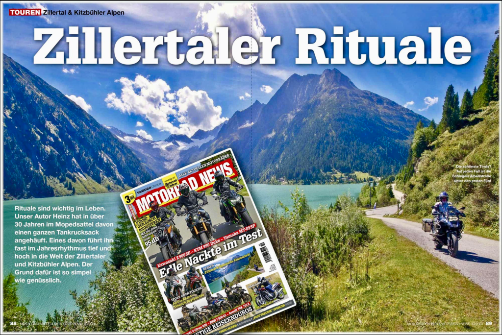 Prächtig anzuschauen im MOTORRAD NEWS Magazin Ausgabe 12/24 – ja okay, für heuer fast schon etwas spät, aber als Tipp für 2025 perfekt geeignet. Wobei das Zillertal im Frühling auch was hat – aber je länger ich nachdenke: Nein der Herbst sollte es sein. Viel Spaß😎